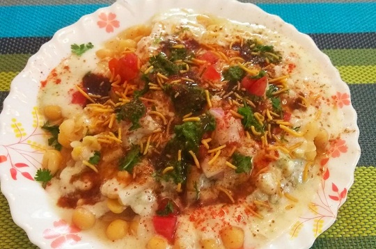इसके ऊपर से बारीक कटा प्याज़, हरी चटनी, लाल चटनी, दही, लाल मिर्च पाउडर और चाट मसाला डालें।