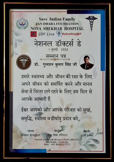 केजीएमयू के दन्त विभाग के विभागाध्यक्ष डॉ0 जी0के0सिंह को कोविड-19 के दौरान किए गये नोबल कार्य के लिए जनधारा फाउण्डेशन और नोवा शेखर हास्पिटल की ओर से प्रशस्ति पत्र देकर सम्मानित किया गया।