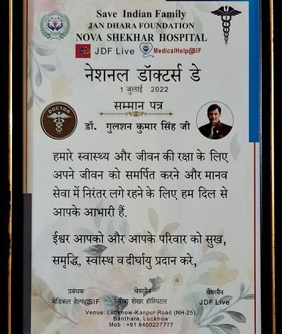 केजीएमयू के दन्त विभाग के विभागाध्यक्ष डॉ0 जी0के0सिंह को कोविड-19 के दौरान किए गये नोबल कार्य के लिए जनधारा फाउण्डेशन और नोवा शेखर हास्पिटल की ओर से प्रशस्ति पत्र देकर सम्मानित किया गया।