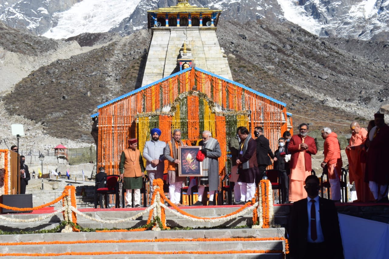 आदि गुरु शंकराचार्य एवं ऋषि-मुनियों की विद्वता का वखान किया। उत्तराखंड को वीर सैनिकों की भूमि बताया,केदारनाथ पहुंचे सभी तीर्थ पुरोहितों, अखाड़ों महामंडलेश्वरों, विद्वत जनों तीर्थयात्रियों का आभार जताया। कहा कि आनेवाले समय में उत्तराखंड चारधाम परियोजना, रेल सड़क से विकास की ऊंचाईयों पर पहुंचेगा। जय केदार के संबोधन के साथ अपना संबोधन पूरा किया। इस अवसर पर प्रधानमंत्री को देवस्थानम बोर्ड ने भगवान केदारनाथ जी का प्रसाद, विभूति, माला, भगवान केदारनाथ जी की प्रतिकृति एवं राज्य पुष्प ब्रह्म कमल की प्रतिकृति भेंट की।