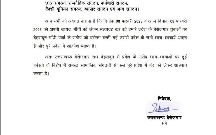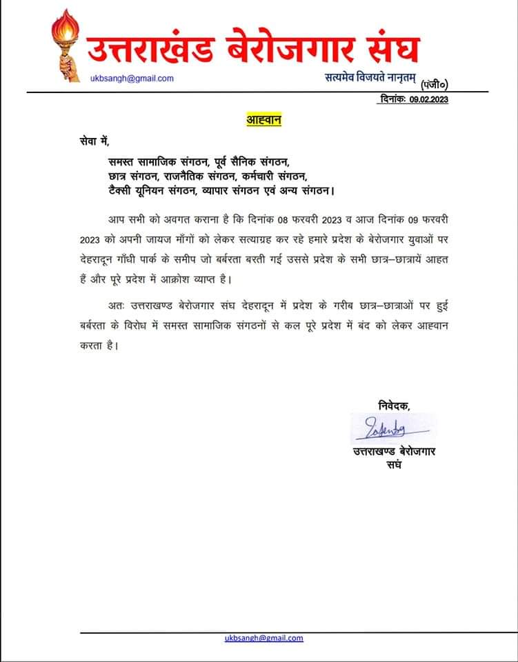 देहरादून 10 फरवरी। बेरोजगार संघ के प्रदेशव्यापी बंद के बीच अपर मुख्य सचिव राधा रतूड़ी से शुक्रवार को सचिवालय में उत्तराखण्ड बेरोजगार संघ के सदस्यों ने भेंट की। उल्लेखनीय है कि प्रदेश भर के युवा छात्र उत्तराखंड में एक के बाद एक भर्ती घोटालों की सीबीआई की मांग कर रहे है। कल एक प्रदर्शन पर पुलिस ने लाठी चार्ज कर दिया तथा दोनों ओर से पथराव भी हुआ जिसमें सैकड़ों छात्र घायल हो गये। बेरोजगार संघ अध्यक्ष बाबी पंवार सहित कई छात्रों को गिरफ्तार कर लिया गया है। युवा अपने साथियों की रिहाई की भी मांग कर रहे है प्रदेश भर में भारी आक्रोश व्याप्त है।