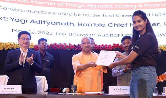 मुख्यमंत्री आज यहां लोक भवन में सैमसंग इनोवेशन कैम्पस कार्यक्रम के अन्तर्गत लखनऊ विश्वविद्यालय से आर्टीफिशियल इंटेलीजेंस, इण्टरनेट ऑफ थिंग्स, बिग डेटा, कोडिंग और प्रोग्रामिंग में प्रशिक्षण पूरा करने वाले लखनऊ विश्वविद्यालय के 383 छात्र-छात्राओं को प्रमाण पत्र वितरण करने के लिए आयोजित कार्यक्रम में अपने विचार व्यक्त कर रहे थे। इस अवसर पर उन्होंने 10 छात्र-छात्राओं को प्रमाण-पत्र प्रदान किए। कार्यक्रम में सैमसंग इनोवेशन कैम्पस कार्यक्रम पर आधारित लघु फिल्म का प्रदर्शन किया गया।