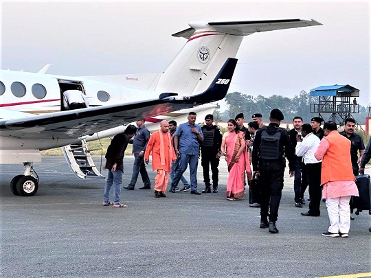 उत्तर प्रदेश के मुख्यमंत्री योगी आदित्यनाथ बाबतपुर एयरपोर्ट, वाराणसी से मंगलवार शाम को जनपद बलरामपुर जाते समय जनपद श्रावस्ती के एयरपोर्ट पर राजकीय विमान से पहुंचे।