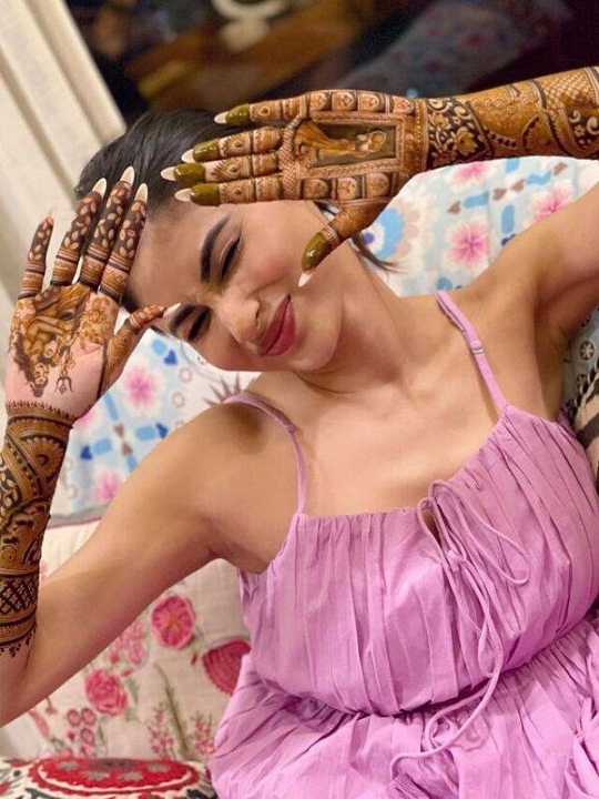 सुहागिनों के श्रृंगार में मेहंदी का खास महत्व है। करवाचौथ पर महिलाएं अपने हाथों पर सुंदर से सुंदर मेहंदी सजाना चाहती हैं। इस बीच एक्ट्रेस मौनी रॉय की मेहंदी काफी वायरल हो रही है। मौनी रॉय का पहला करवाचौथ है। इस मौके पर उन्होंने हाथों पर खूबसूरत मेहंदी सजाई है।