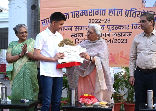उत्तर प्रदेश की राज्यपाल श्रीमती आनंदीबेन पटेल की प्रेरणा से राजभवन में चल रही राजभवन परम्परागत खेल प्रतियोगिता-2023 का समापन समारोह एवं पुरस्कार वितरण कार्यक्रम का आयोजन राजभवन के छोटे लॉन में आयोजित किया गया। जिसमें राज्यपाल ने प्रतियोगिता में उत्कृष्ट प्रदर्शन करने वाले खिलाड़ियों को पुरस्कार एवं प्रमाण-पत्र देकर सम्मानित किया।