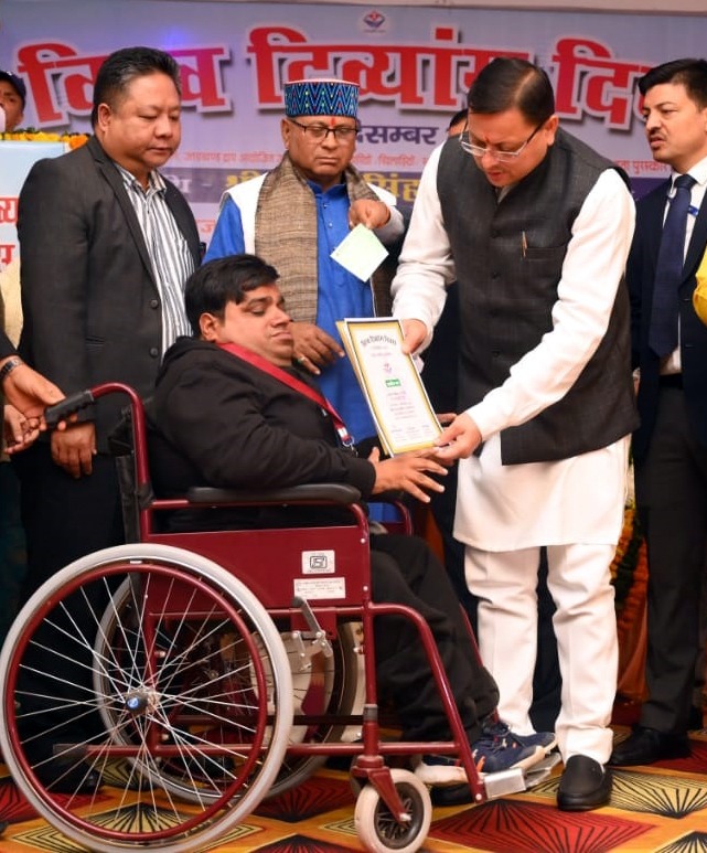 देहरादून 3 दिसंबर।दिल्ली मुख्यमंत्री पुष्कर सिंह धामी ने शनिवार को विश्व दिव्यांग दिवस के अवसर पर सुभाष रोड स्थित लॉर्ड वेंकटेश्वर हॉल में समाज कल्याण विभाग द्वारा आयोजित राज्य स्तरीय दक्षता पुरस्कार समारोह में दिव्यांगजनों को सम्मानित किया। इस अवसर पर मुख्यमंत्री ने कुल 32 दिव्यांगजनों को प्रशस्ति पत्र, मेडल, मान पत्र एवं 5-5 हजार की धनराशि देकर सम्मानित किया। जिसमें 10 उत्कृष्ट दिव्यांग कर्मचारी, 11 दक्ष दिव्यांग खिलाड़ी, 10 स्वतः रोजगार में रत दिव्यांगजन एवं 01 सेवायोजक अधिकारी शामिल है। इस अवसर पर मुख्यमंत्री ने दिव्यांगजनों के बीच जाकर उनका हौंसला बढ़ाया।