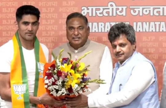 नई दिल्ली। ओलंपियन मुक्केबाज व कांग्रेस नेता विजेंदर सिंह बुधवार को यहां भारतीय जनता पार्टी (भाजपा) में शामिल हो गए। भाजपा महासचिव विनोद तावड़े, दिल्ली विधानसभा में विपक्ष के नेता और दक्षिण दिल्ली से पार्टी के उम्मीदवार रामवीर सिंह बिधूड़ी की मौजूदगी में विजेंदर सिंह ने भाजपा की सदस्यता ग्रहण की।