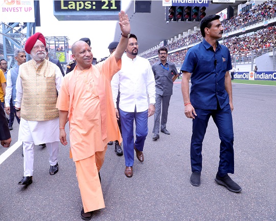 उत्तर प्रदेश के मुख्यमंत्री योगी आदित्यनाथ ने आज जनपद गौतमबुद्धनगर के ग्रेटर नोएडा स्थित बुद्ध इंटरनेशनल सर्किट में आयोजित मोटो-जी0पी0 भारत-2023 की मुख्य रेस का अवलोकन किया। रेस खत्म होने के बाद मुख्यमंत्री जी एवं केन्द्रीय युवा मामले और खेल मंत्री श्री अनुराग सिंह ठाकुर ने पोडियम एरिया में शीर्ष 03 राइडर्स को ट्रॉफी प्रदान की। मुख्यमंत्री ने रेस के विजेता श्री मार्को बेजेची को प्रतियोगिता की ट्रॉफी प्रदान की।
