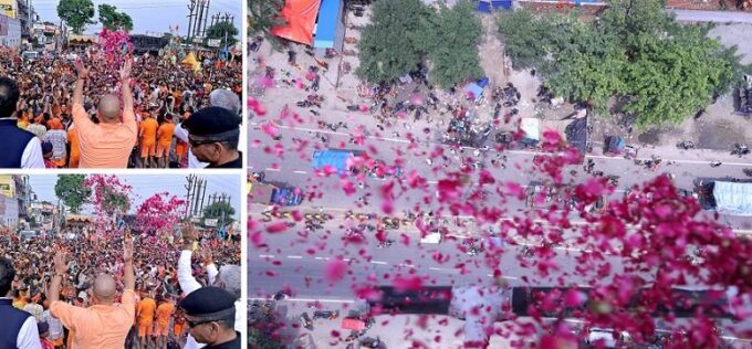 मेरठ-दिल्ली हाइवे पर सीएम योगी ने कांवड़ियों पर की पुष्पवर्षा, शिवभक्तों ने किया योगी-योगी का उद्घोष