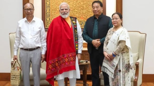 मणिपुर के मुख्यमंत्री युमनाम खेमचंद सिंह ने मंगलवार को नई दिल्ली में प्रधानमंत्री कार्यालय में प्रधानमंत्री नरेंद्र मोदी से मुलाकात की। मुख्यमंत्री खेमचंद ने राज्य सरकार के तीन सदस्यीय प्रतिनिधिमंडल का नेतृत्व किया। प्रतिनिधिमंडल में राज्य के दो उपमुख्यमंत्री, भाजपा की नेमचा किपगेन और नागा पीपुल्स फ्रंट (एनपीएफ) की लोसी दिखो भी शामिल थे। नेमचा किपगेन मणिपुर की पहली महिला उपमुख्यमंत्री हैं, जो कांगपोकपी जिले की निवासी हैं।