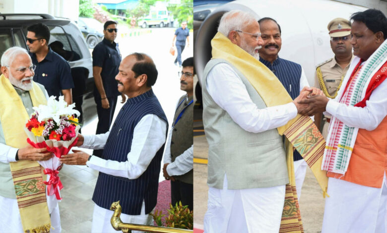 उनके आगमन पर उनका भव्य स्वागत किया गया और आदिवासी महिलाओं ने आदिवासी गीतों की धुनों तथा ढोल की थाप पर नृत्य प्रस्तुत किया। प्रधानमंत्री हवाई अड्डे से सीधे राजभवन पहुंचे, जहां वह कुछ समय बिताएंगे। वह शाम को शपथ ग्रहण समारोह स्थल जनता मैदान के लिए रवाना होंगे।
