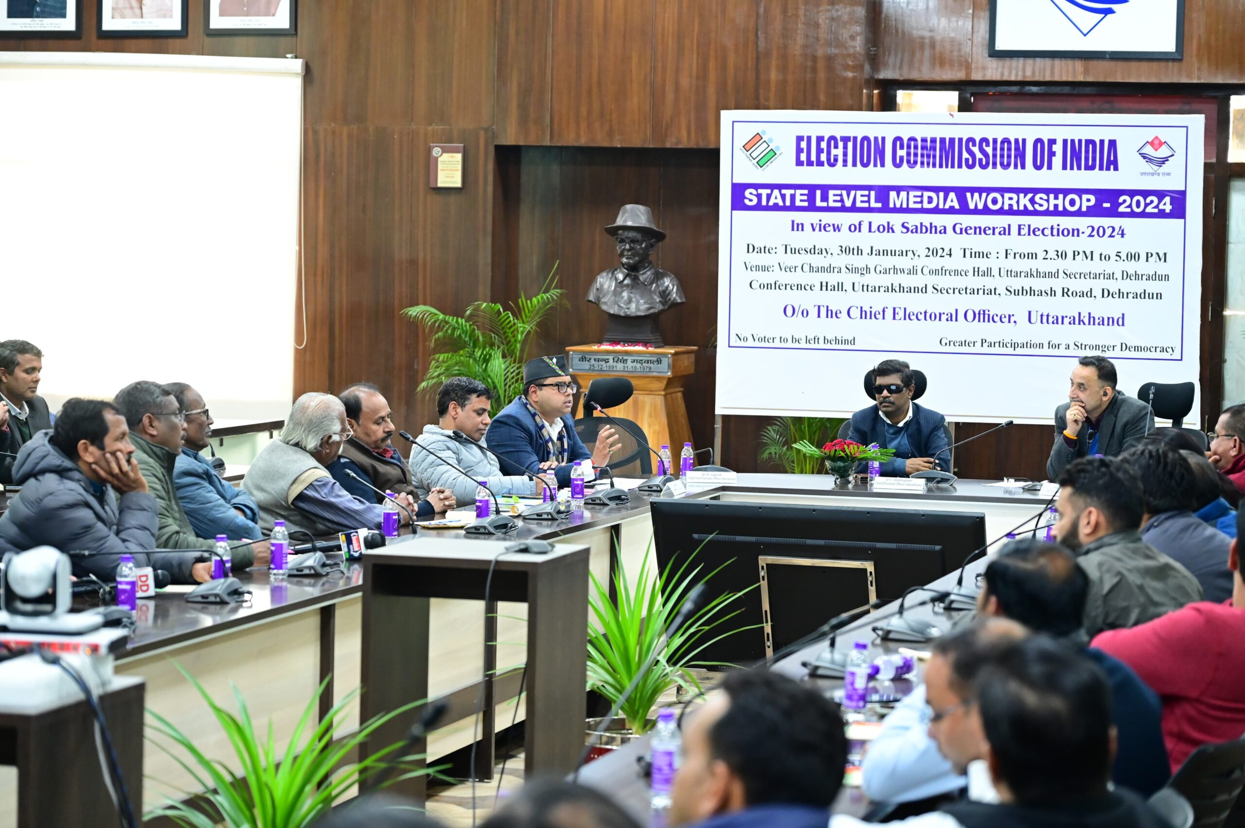 देहरादून: 30 जनवरी।मुख्य निर्वाचन अधिकारी वी षणमुगम की अध्यक्षता में मंगलवार को सचिवालय में राज्य स्तरीय मीडिया कार्यशाला 2024 का आयोजन किया गया।