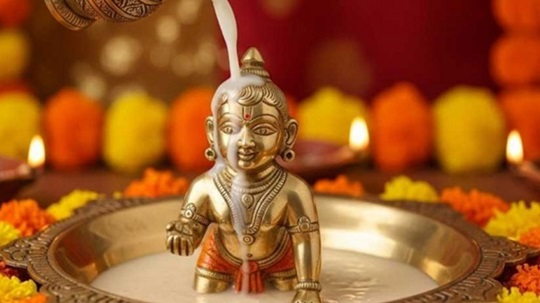 भगवान कृष्ण की मूर्ति या चित्र को चौकी पर स्थापित किया जाता है, और उनका पंचामृत (दूध, दही, घी, शहद, और चीनी का मिश्रण) से अभिषेक किया जाता है।