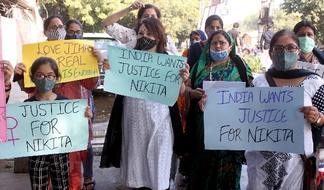 फरीदाबाद में निकिता तोमर की हत्या की वजह कथित तौर पर यह बताई गयी थी कि उसने हिंदू से मुसलमान बनने से मना कर दिया था। उसका मुसलमान प्रेमी उसे शादी के पहले मुसलमान बनने का आग्रह कर रहा था। हरियाणा के बल्लभगढ़ में दिनदहाड़े एक आदमी ने एक लड़की (निकिता) की गोली मार कर हत्या कर दी। अपराधी गिरफ्तार। मृतका के पिता ने बताया, “मेरी बेटी कॉलेज फाइनल ईयर के पेपर देकर आ रही थी कि तभी कुछ लोग उसे जबरदस्ती खींचकर गाड़ी में बिठाने की कोशिश करने लगे। जब वो नहीं बैठी तो उसे गोली मार दी।” यह पूरा मामला लव जिहाद से जुड़ा था। यह शब्द लव-जिहाद 2009 में सामने आया, जब केरल और कर्नाटक के कैथोलिक ईसाइयों ने शोर मचाया कि उनकी लगभग 4000 बेटियों को प्रलोभन देकर या डरा कर मुसलमान बना लिया गया है। एक-दो मामले उच्च और सर्वोच्च न्यायालय में भी चले गए।
