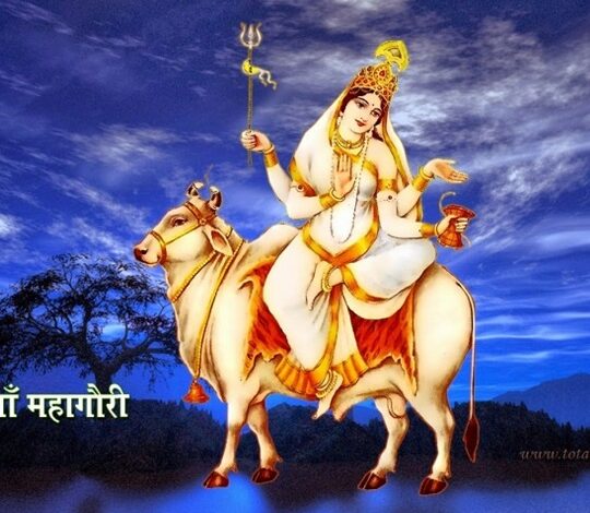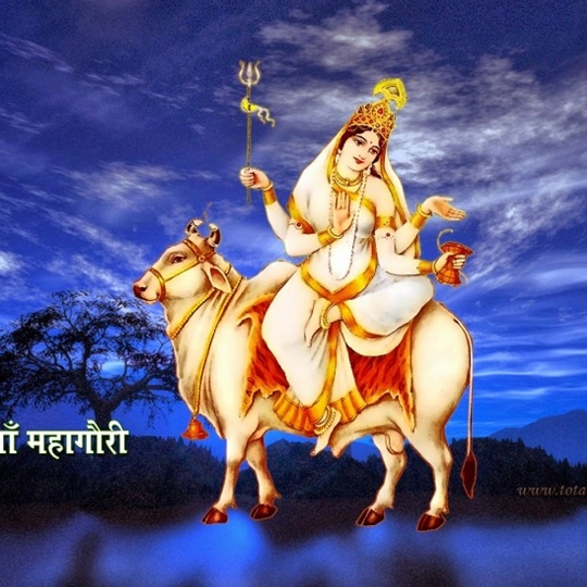 मां दुर्गा की आठवीं शक्ति मां महागौरी हैं। इनका वर्ण अत्यंत गौर है और मां ने वस्त्र व आभूषण भी सफेद धारण किए हैं। मां महागौरी की चार भुजाएं हैं और इनका वाहन बैल है। मां अपने हाथों में त्रिशूल, अभय मुद्रा, डमरू और वर मुद्रा धारण किए हैं। महागौरी का स्वभाव अत्यंत शांत है। मां महागौरी की आयु 8 वर्ष मानी जाती है।